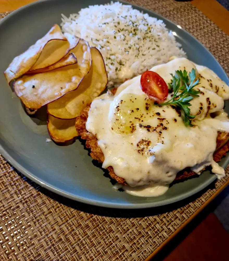 Gratinado de tilápia empanada no panko com banana e molho branco, finalizada com queijo. Acompanha arroz.