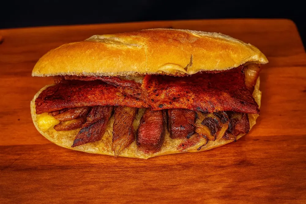 Pão baguete, 150g de picanha grelhada, queijo muçarela, cebola caramelizada e molho de alho.
