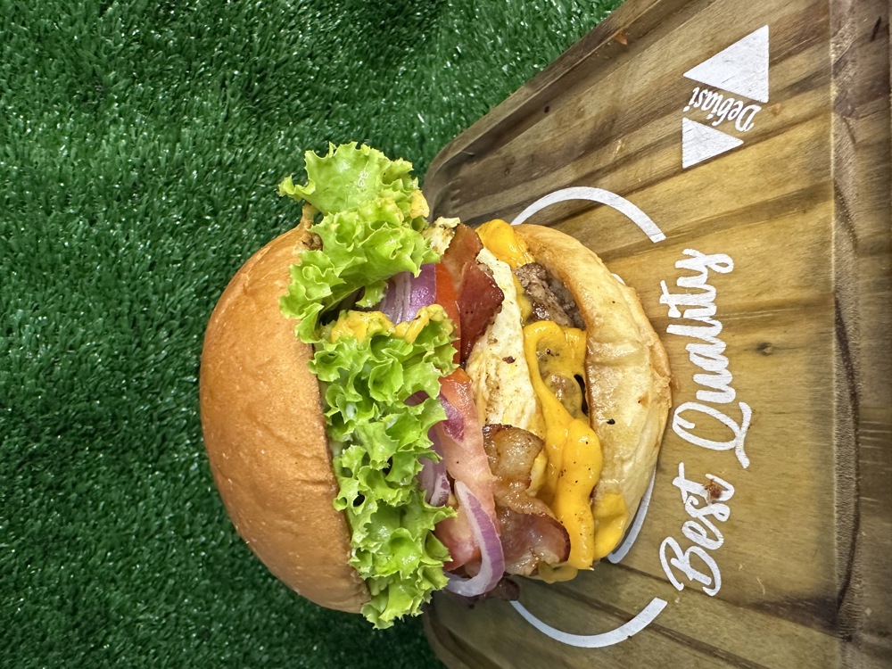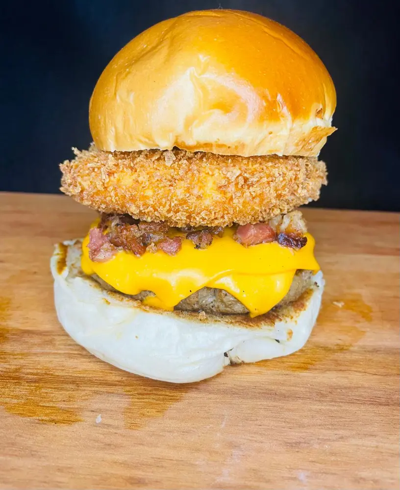 PÃO DE BRIOCHE, CARNE GOURMET, CEBOLA CARAMELIZADA, QUEIJO CHEDDAR, MAIONESE CASEIRA E BAON.