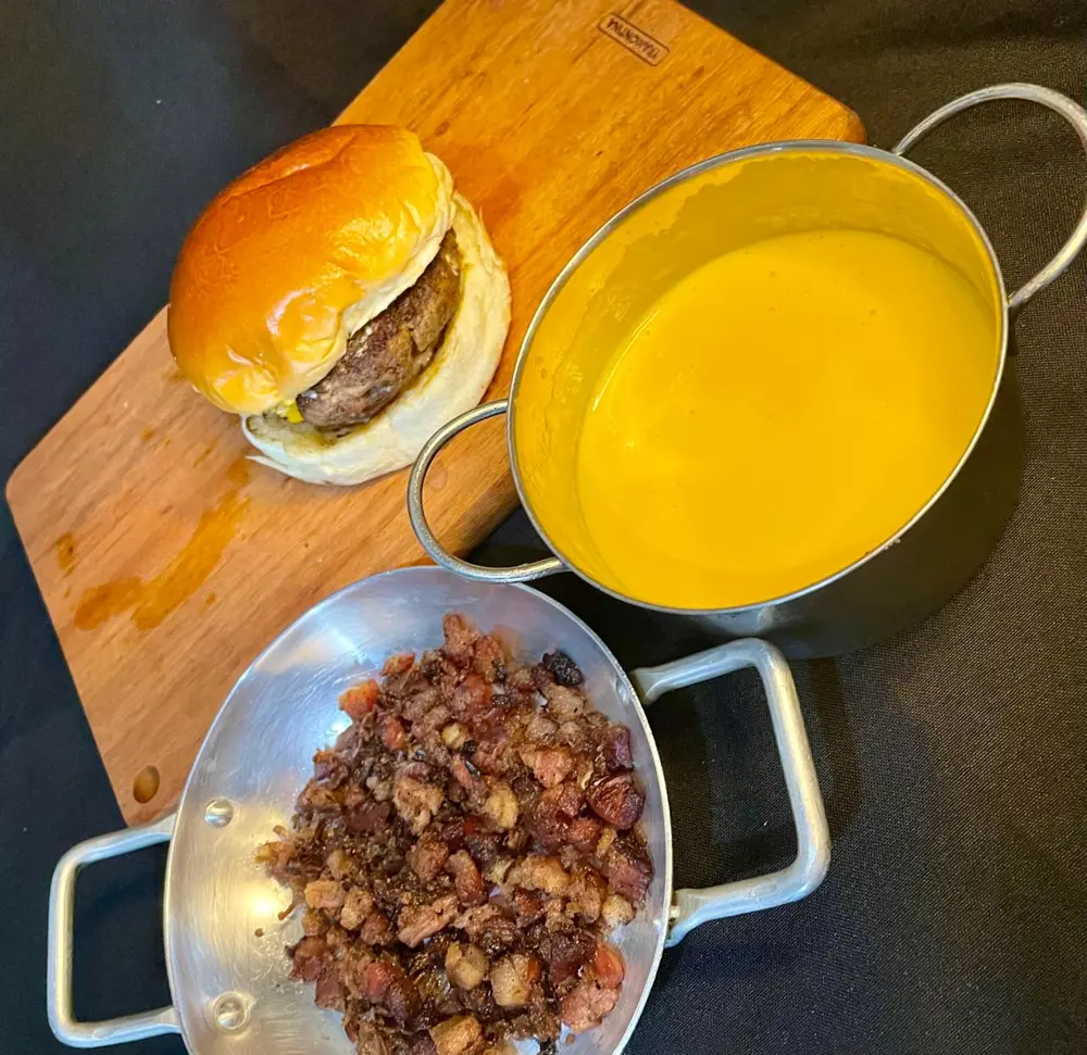 PÃO DE BRIOCHE, CARNE GOURMET, QUEIJO CHEDDAR, MOLHO CHEDDAR E BACON.