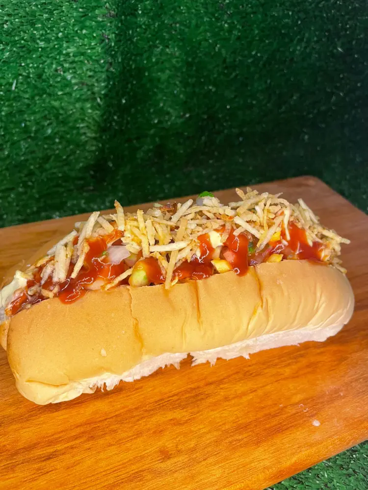 Pão, salsicha, frango, vinagrete, molho e batata palha