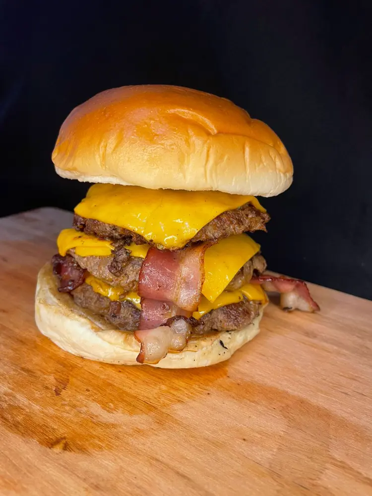 PÃO DE BRIOCHE, 03 HAMBÚRGUERS GOURMET, QUEIJO CHEDDAR E MOLHO ESPECIAL.
