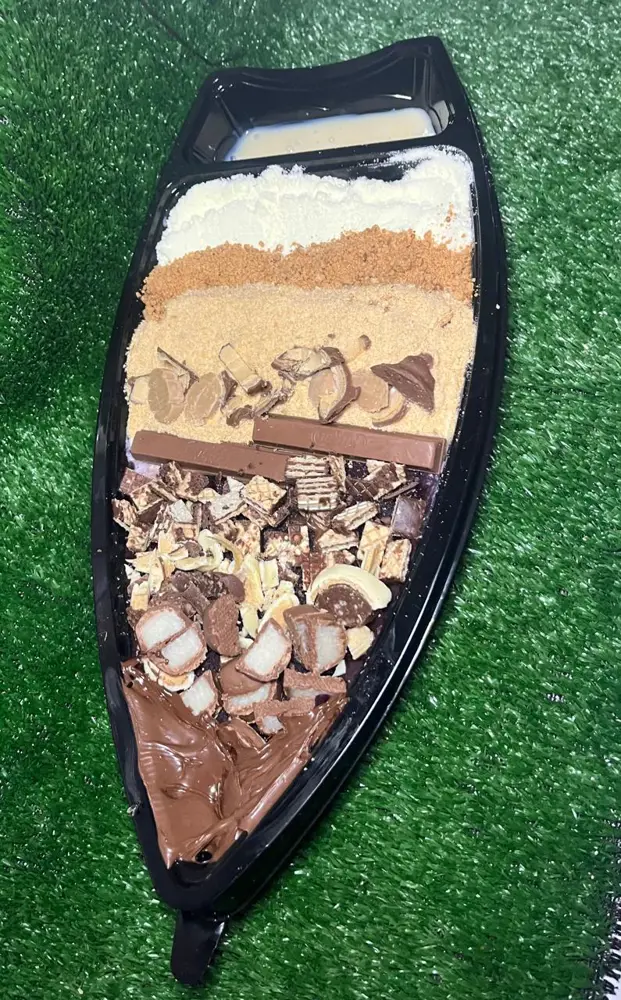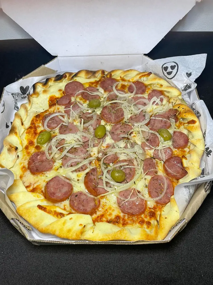 Pão, salsicha, frango, creme chesse, queijo cheddar, 2 cebolas empanadas, molho barbecue