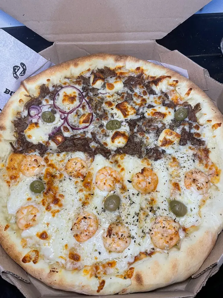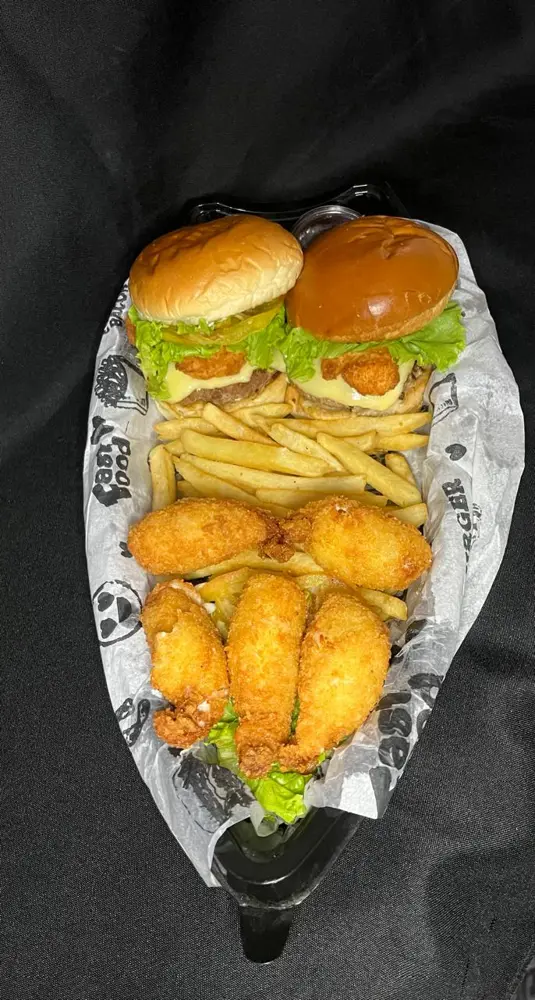 PÃO DE BRIOCHE, CAMRÃO EMPANADO, QUEIJO MUSARELA, SALADA E MOLHO ESPECIAL.
