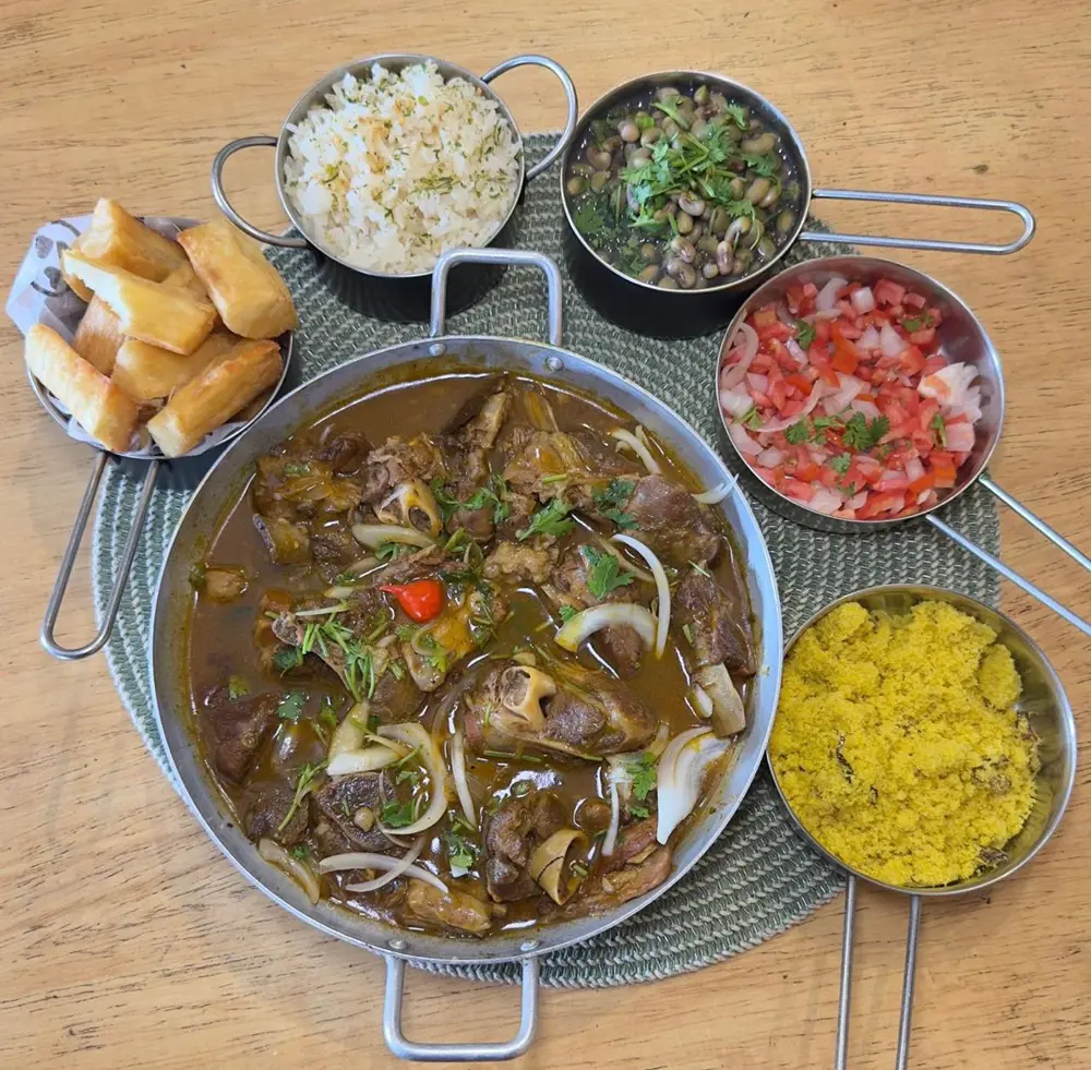 carneiro cozido lentamente com temperos caseiros, regado levemente ao vinho. Servido com arroz , feijão verde, macaxeira frita, farofa e vinagrete