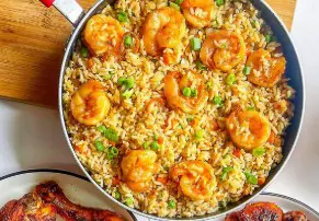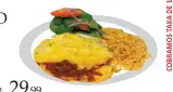 (camarão à milanesa, gratinado com queijo e arroz à grega)