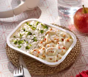 Estrogonofe de frango (120g) envolvido com delicioso molho especial, acompanha arroz branco (150g) e pure de batata (100g)