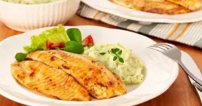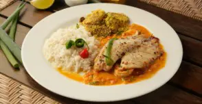 (Filé de peixe, camarão, arroz branco e purê de batata)